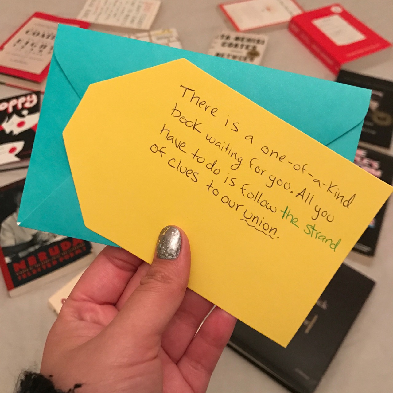You arrived to the Strand and I handed you the second clue, leading you to a book with another clue hidden inside. Six books and the most nerve-wracking hour of my life later, you found your way to the final book with the proposal written inside.